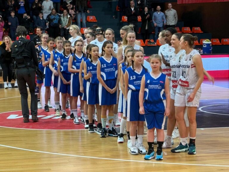 Abseits von der starken Leistung des durchaus jungen österreichischen Nationalteam war eines der Highlights, dass die Spielerinnen der WU12 mit der Mannschaft gemeinsam aufs Parkett laufen durften und so das Spiel und die Atmosphäre hautnah miterleben durften, wie es ist fürs österreichische Nationalteam auflaufen zu dürfen!